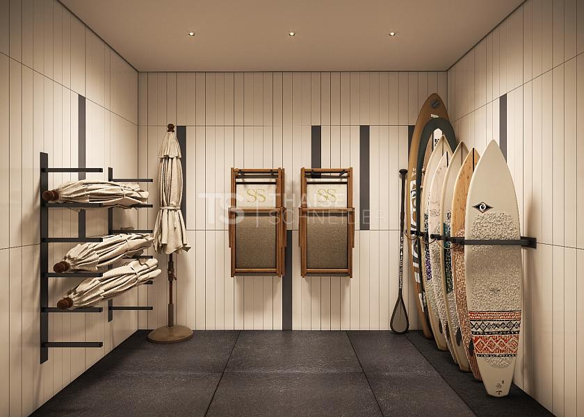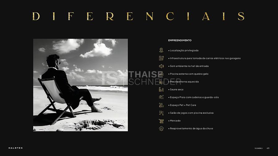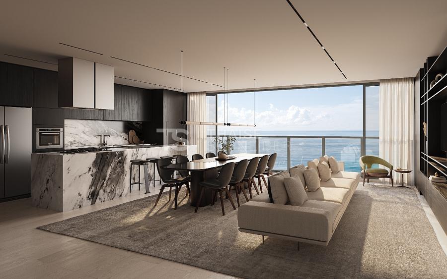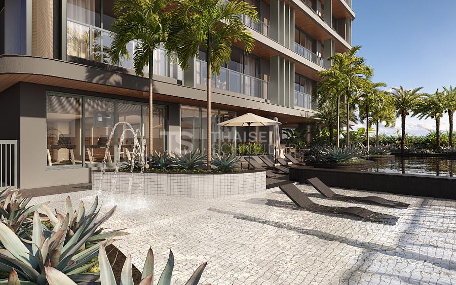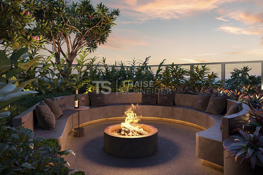 As áreas comuns foram desenhadas para acolher momentos especiais com amigos e familiares, com espaços funcionais, charmosos e amplas varandas integradas ao living, valorizando a vista para o oceano. O paisagismo assinado por Nadia Bentz complementa o projeto com vegetação nativa e exuberante, proporcionando uma atmosfera tranquila e sofisticada.